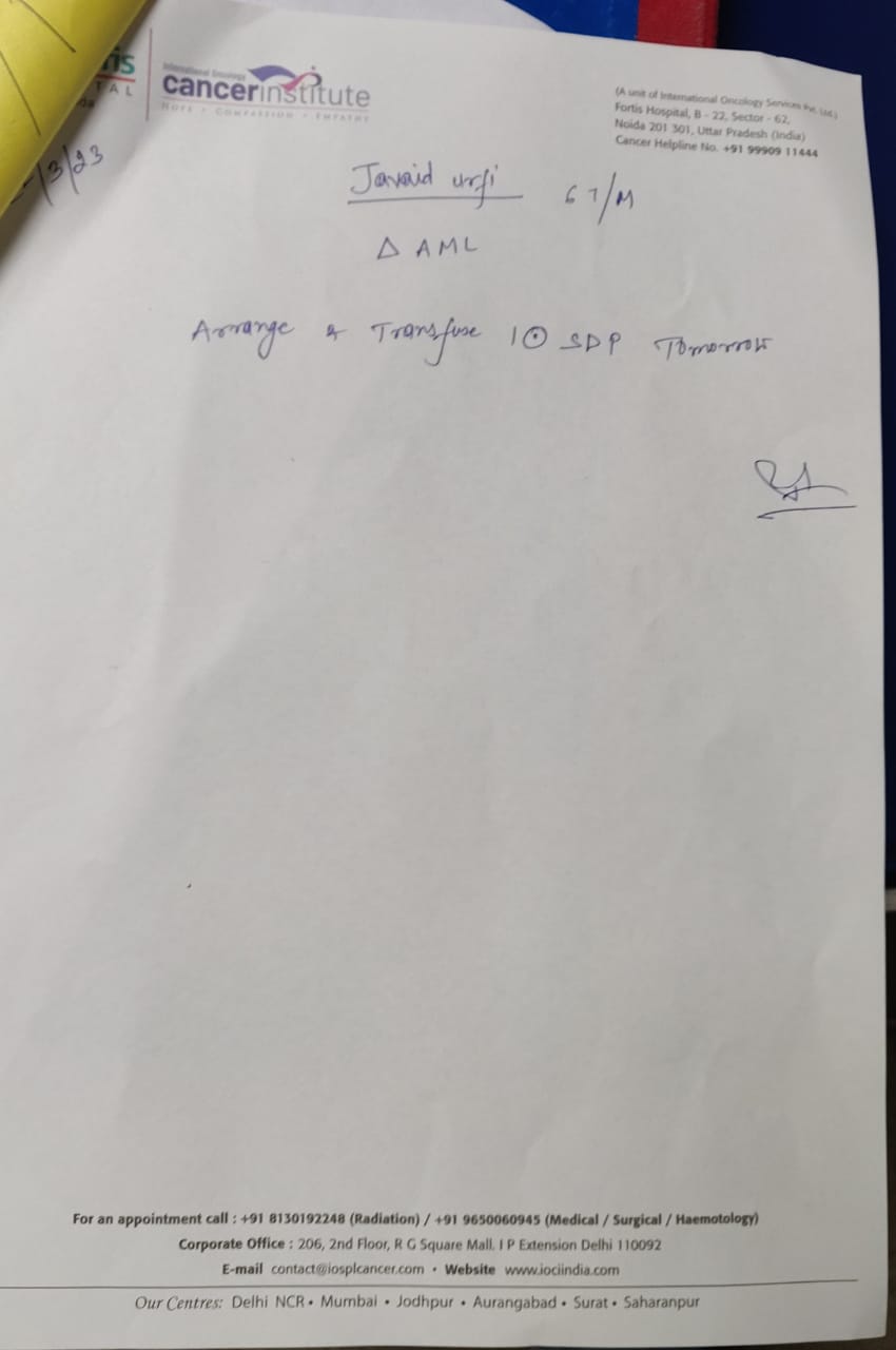 I need B+ platelet donor urgently at Fortis Hospital, Noida for my father