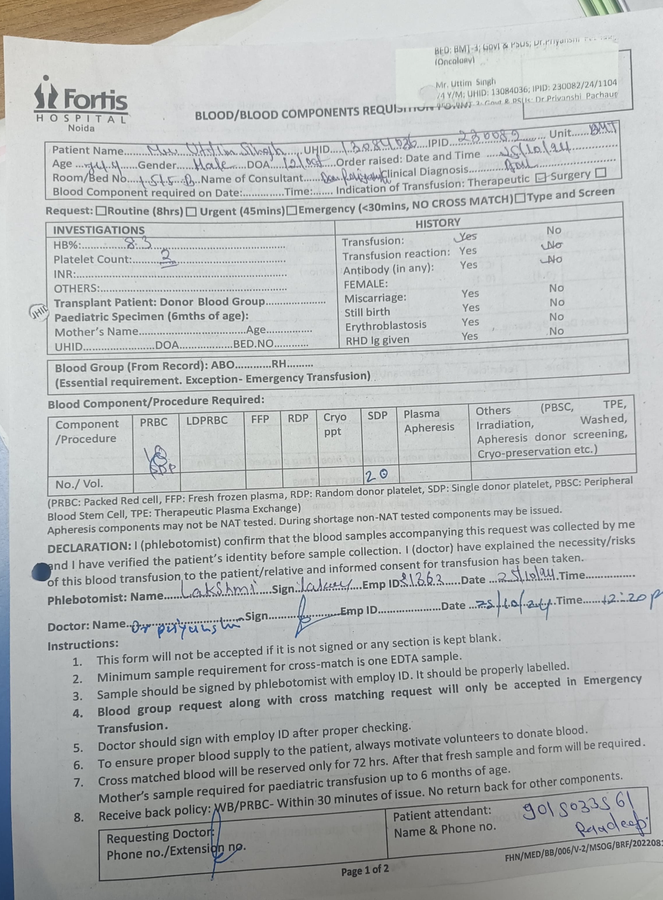 I need B+ SDP for my father in Fortis Hospital sector 62 noida